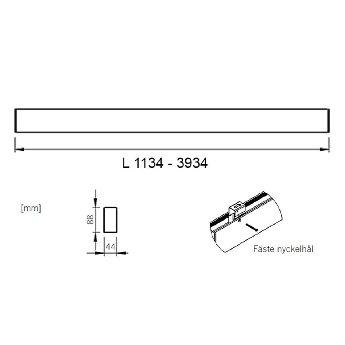 Egenskaper LED 3000K / 4000K. Tunable white / annan färgtemperatur som tillval Inbyggd driver one4all Ljusfördelning 35% upp / 65% ned som standard, annan som tillval Tillval: närvarosensor 20 min / dagsljussensor Tillval: nödljus (10% 1h) UGR: 16,3 Diktmonteras med nyckelhålsfäste Standardfärg: vitlackerad RAL9003 finstruktur. Tillval: annan färg Bilder