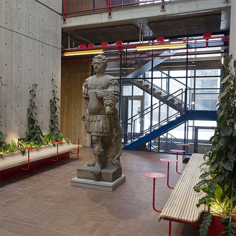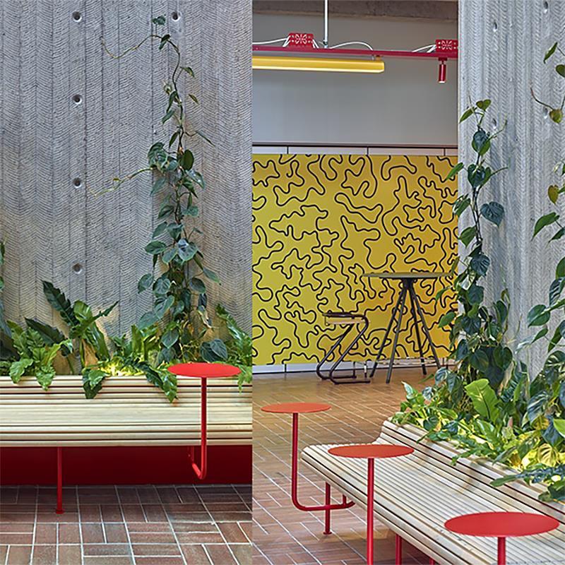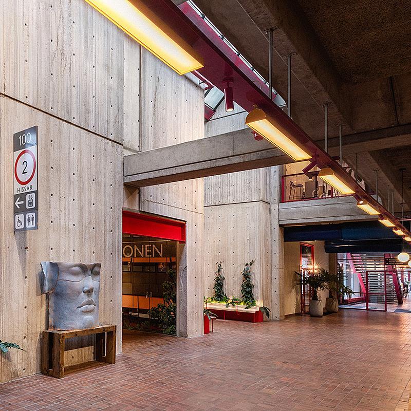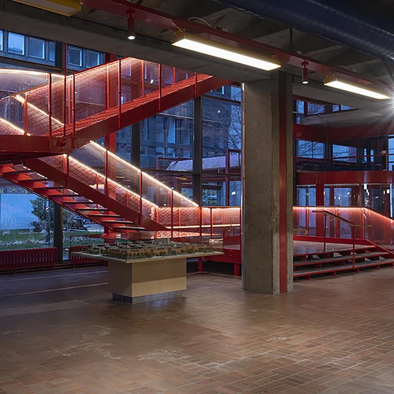 I bottenvåningen finns långa öppna arkader, genombrutna av ljusa gårdar, konstverk, restauranger och frilagda installationer. De klara färgerna är ett genomgående tema och vi har fått äran att bidra till en mycket speciell detalj: de klargula armaturerna som löper genom arkaderna, monterade på rödlackerade profiler.
