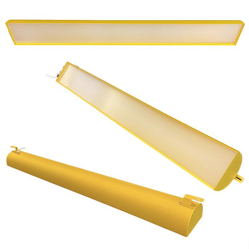 Vi fick för några år sedan i uppdrag att tillverka en replika av den gula originalarmaturen tog då fram nya armaturhus av fasettbockad plåt. Totalt är 78 stycken armaturer installerade, 1410mm långa och med prismatisk avbländning. Dalidrivers är integrerade och varje armatur tar 14,4W i 3000K.